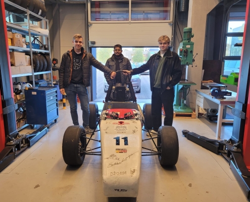 Foto: Emīls Erciņš, Pēteris Skrastiņš un Soubhik Bhowal, RTU studentu formulas dalībnieki un RTU studenti.