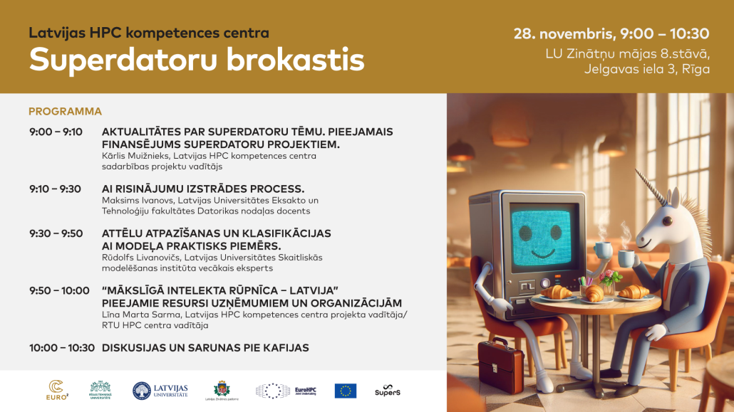 RTU HPC centrs sadarbībā ar HPC kompetences centru Latvijā EuroCC 2 projekta ietvaros aicina uzņēmējus uz Superdatoru brokastīm, kas notiks 28. novembrī no plkst. 9:00 līdz 10:30 Latvijas Universitātes Zinātņu mājas 8. stāvā, Jelgavas ielā 3, Rīgā.